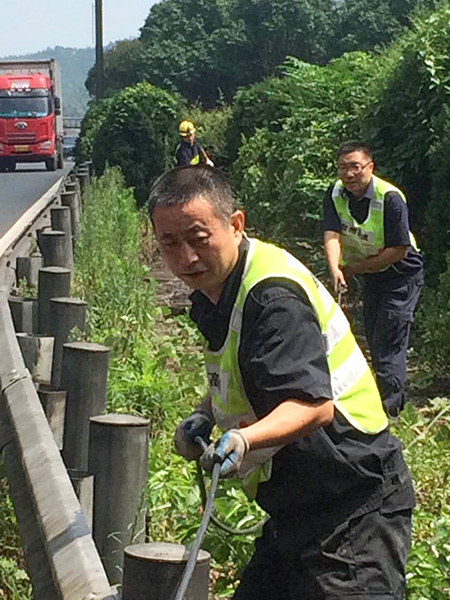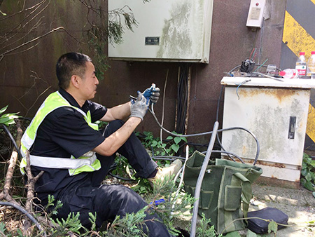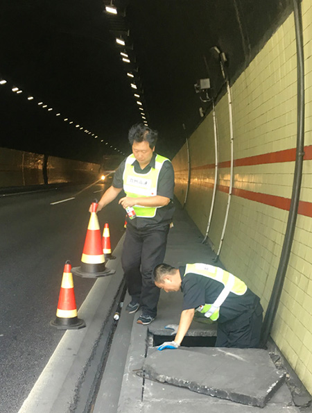 圖為修復后的隧道口路燈 對于修復被盜電纜,一般最直接的做法是重新再拉一根新電纜至配電箱,利用箱內現成的控制開關和交流接觸器等元器件,完成整個電纜連接工作,但中心隊員考慮到此種方法不僅工作量大,修復成本高,而且存在再次被盜的可能性,如果用鋁線代替,電力傳輸又要大打折扣。于是,他們另辟蹊徑,計劃從剩余配電箱至路燈還有200余米未被盜取的電纜中截取一段,直接和洞口情報板電纜相接,這樣既能節省人力、物力,又能以最快速度恢復路燈正常工作。 當天一早,中心隊員帶上相應的工具和設備直奔現場,在確認電纜位置及走向后,便著手抽離洞內電纜。考慮到洞口到配電箱電纜至少有100余米,電纜溝下面又鋪有其他眾多電纜以及之前掉落的垃圾,直接從洞口抽離根本無法動彈。于是,中心4名隊員便每隔10米左右用撬棍撬開上面水泥蓋板,整個人跳進電纜溝內,彎著腰一段一段抽離。抽到最后一個溝時,4人頂著烈日,齊力把重達近百斤電纜抽離整個電纜溝并放置在護欄內側草地上,隨后再從抽出的這段電纜中剪取適當長度,重新鋪設后與寧向出洞口的情報板電纜相接。 臨近中午,戶外溫度不斷升高,中心隊員早已濕透衣背,為趕在一天中最熱的時間點前完成任務,4名隊員臨近解決午餐又迅速奔赴現場,拆除原配電箱內的舊器件,將其用回到新的供電線路中,而多余的器件則捆綁打包帶回中心以留備用,節省公司后期維養成本。 下午1:40,經過通電測試,9盞路燈全部恢復正常工作。集團總工程師江輝在工程部微信群里肯定了中心工作,并提醒一線人員切記做好防暑降溫工作,注意自身身體狀況。