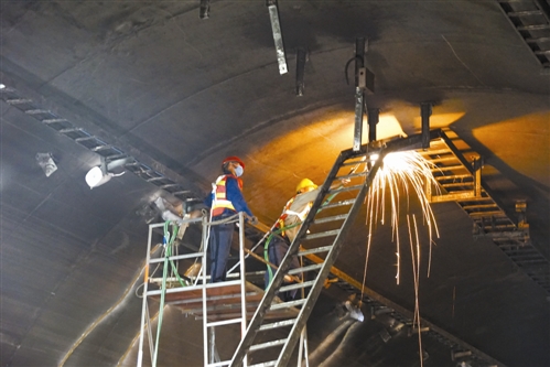 另一處作業面,負責焊接的王師傅拿著器械,正目不轉睛地盯著焊接面。“焊接對精度技術要求很高,焊縫還要檢測,得一次成型,否則施工就不合格。”從事多年電焊工的他常常腰酸腿疼,落下“身疾”,“不過時間久了也就習慣了,堅持就是勝利。”王師傅依然很樂觀地看待自己的工作。