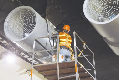 走進隧道,一股冷風侵襲,洞內風大又潮。來自湖北的游師傅,負責噴隧道墻面乳膠漆。他有著20多年的豐富經驗,在施工現場,他頭戴安全帽,身穿反光背心,緊系安全繩,一個人站在高高的架子上,底下4名工人不時緩緩地推動登高架。游師傅全然不顧洞內的濕冷,大手一揮,熟練而均勻地噴灑著油漆,沒多久墻面便嶄新一片。