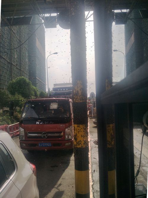 圖為蜜蜂集聚在收費(fèi)站 原來這輛綠通車運(yùn)輸蜂箱,由于蜂箱沒有關(guān)閉嚴(yán)實(shí),在車通過車道檢查稍作停留時(shí),大量的蜜蜂乘機(jī)逃出,圍攻收費(fèi)崗?fù)?,天空瞬間一片密密麻麻。它們有的停留在車道的防撞柱上,有的在收費(fèi)窗口附近盤旋,遲遲不肯離開,嚇得過收費(fèi)站等待繳費(fèi)的司機(jī)不敢開車窗繳費(fèi)。