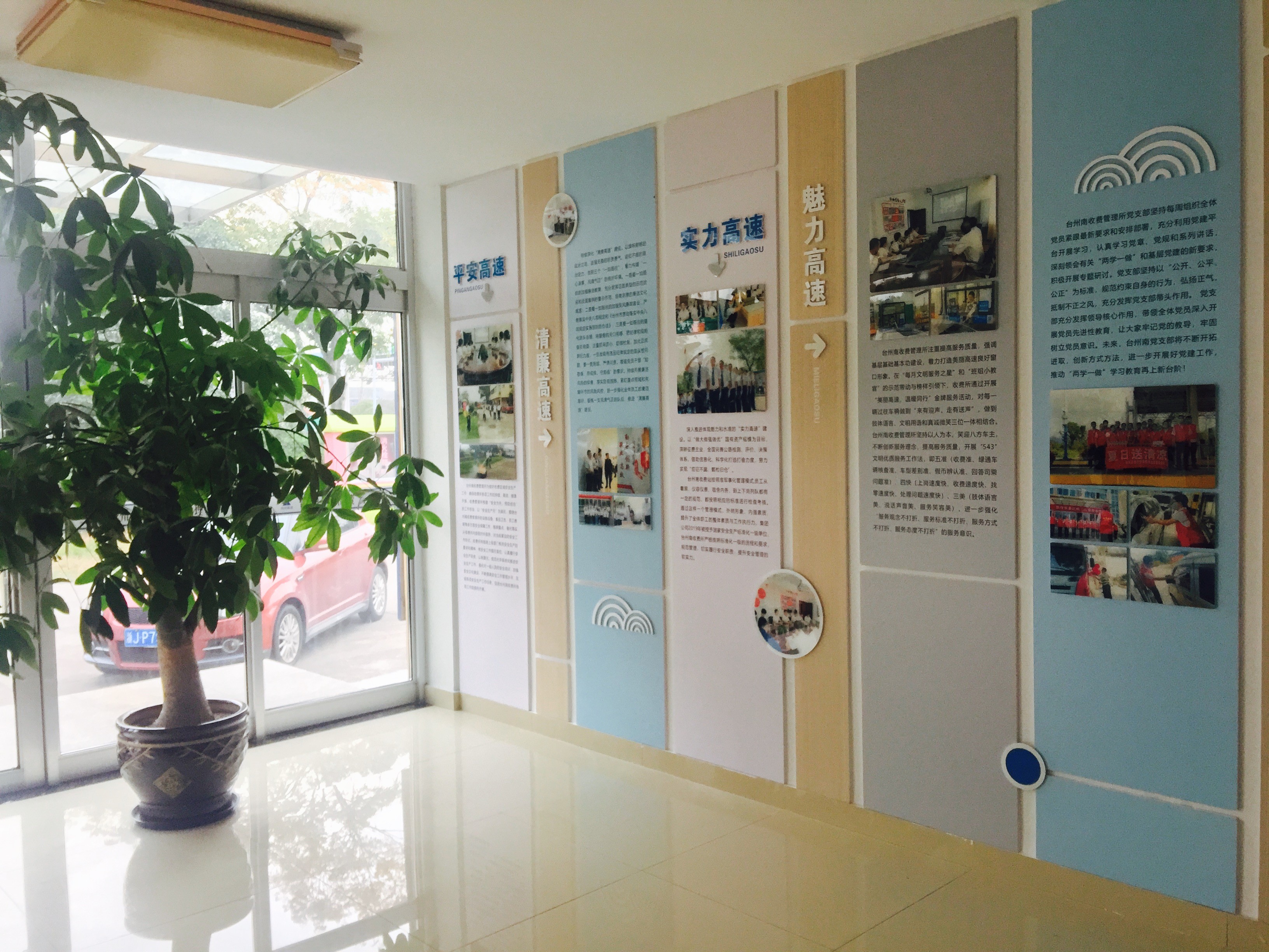 圖為新的黨建介紹版 12月1日,臺州南收費所員工自己動手,所長帶領當日在所員工陸冰、金曉斌、周峰開展黨建舊介紹版的拆除工作,為新黨建介紹版安裝做好準備。