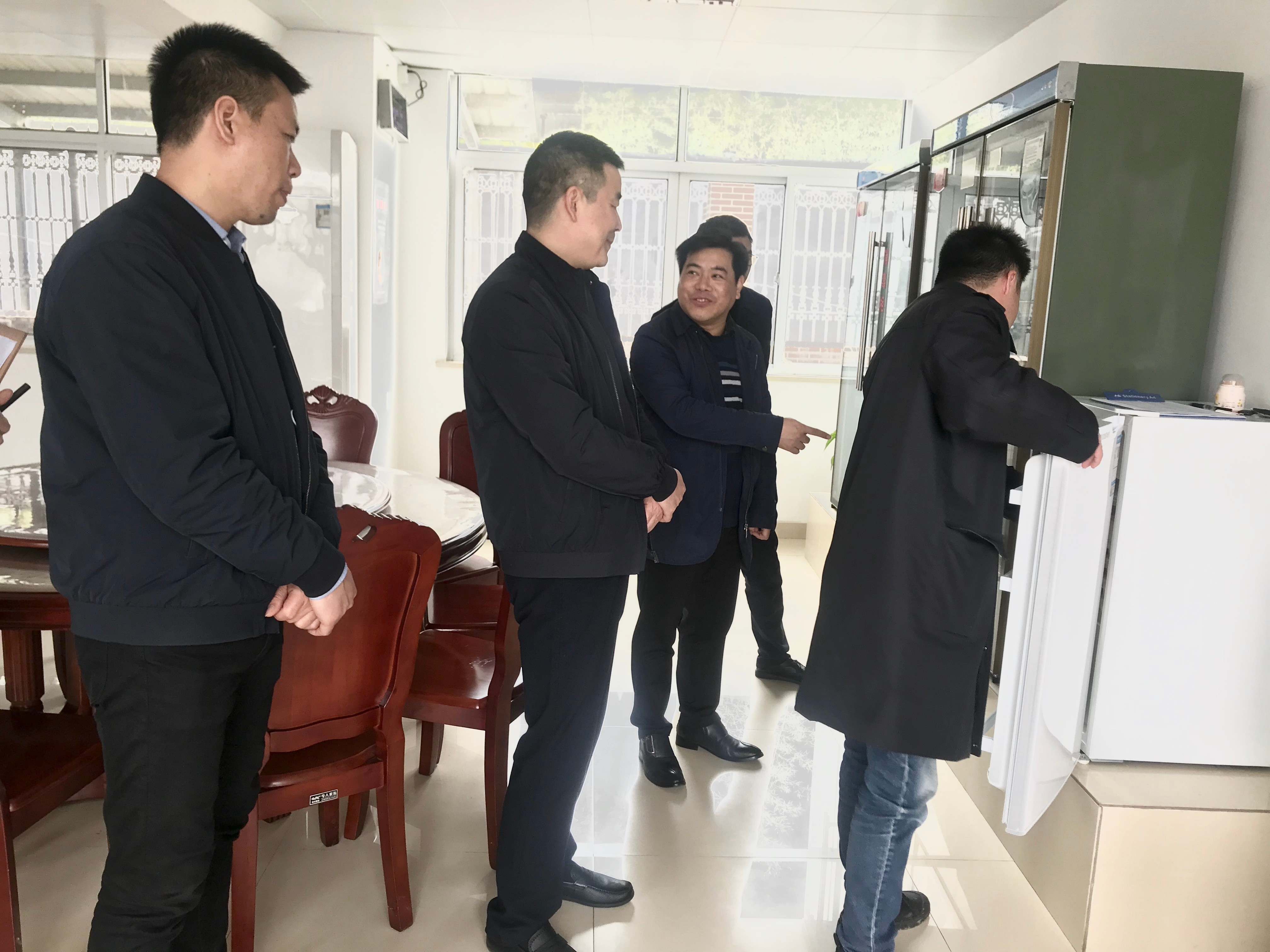 (圖為參觀食堂留樣樣品) 王根法一行人先后參觀了食堂、餐廳、寢室、閱覽室、陽光房等,在參觀的過程中,杜佳介紹了收費所的整體運行情況,食堂管理制度等,在寢室內務方面,他對床單要怎么鋪,被子要怎么疊,臉盆、毛巾、牙杯要怎么擺放等作了詳細講解,雙方相互交流分享好的經驗。