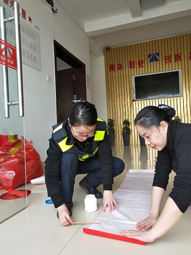 圖為工作人員為營造春節氣氛分工合作 此外,大家在收費所宿舍區、辦公樓、收費區域等地方貼“?!弊帧①N對聯、掛燈籠、插彩旗,以大紅或金黃色為主色調,充分烘托出收費所“祥和、喜慶、歡快”的節日氛圍。