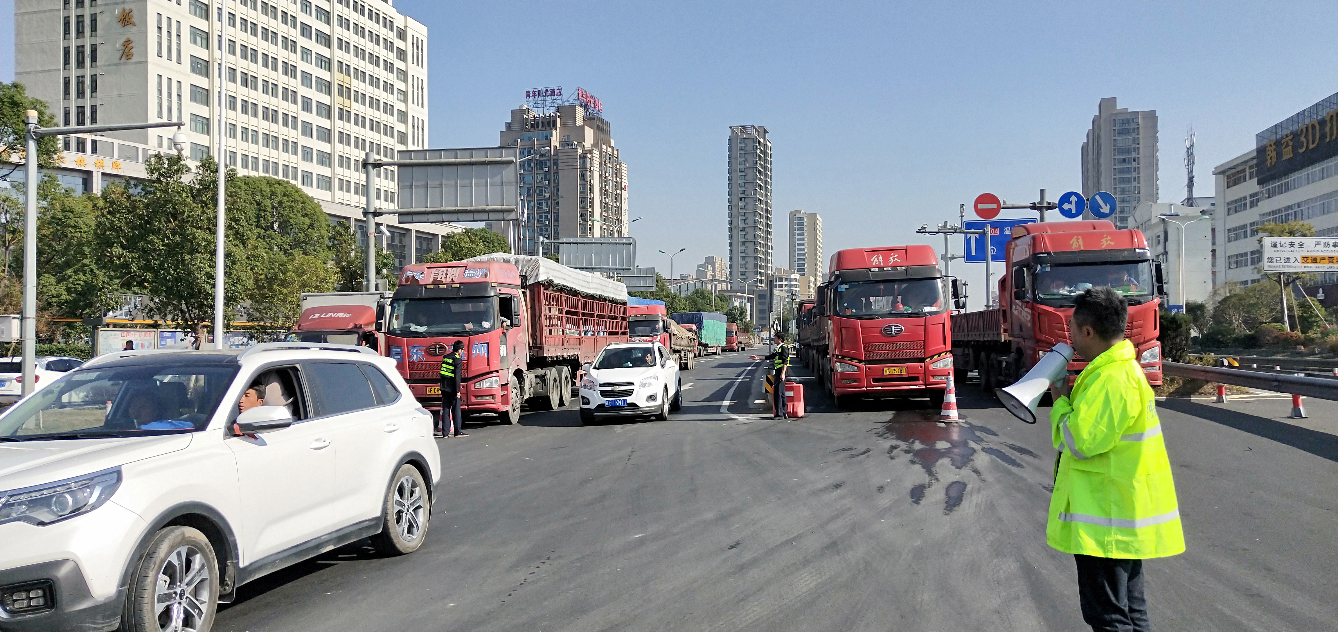圖為所班子成員帶頭指揮交通 早上8點11分,接到監控中心電話:入口開通,開足兩個人工車道。當時正值新收費模式開通前對稱重超限車輛勸返工作的開始。經過幾個小時封道,此時的入口車流已經一望無際,如果碰到超限車輛,勸返更是難上加難。 在困難中想對策,所領導班子成員提出“輪流式放行”:入口的車輛分別是從橋上和橋下過來,分為4個車道,每個車道輪流放行5分鐘,這樣井然有序,不容易造成擁擠和交通事故,并且可以快速放行。每個車道前都擺放了一個小紅帽,專人看守。其他人員分別在入口指揮,藍牌貨車和未安裝ETC的車輛從大小客車車道通行,大貨車從混合車道通行,裝有ETC的客車和集裝箱走ETC專用通道。大家不斷穿梭在車道、廣場之間,向司機一遍遍耐心解釋,指揮每一輛車順利通行。1名孕婦行動不便,被分在監控室接聽電話,查詢入口無信息的車道。所有人一身汗,忙得顧不上喝一口水,臨近飯點也沒有人主動去吃飯,大家都頂住壓力,從黎明到黃昏一心想著快速準確高效放行。