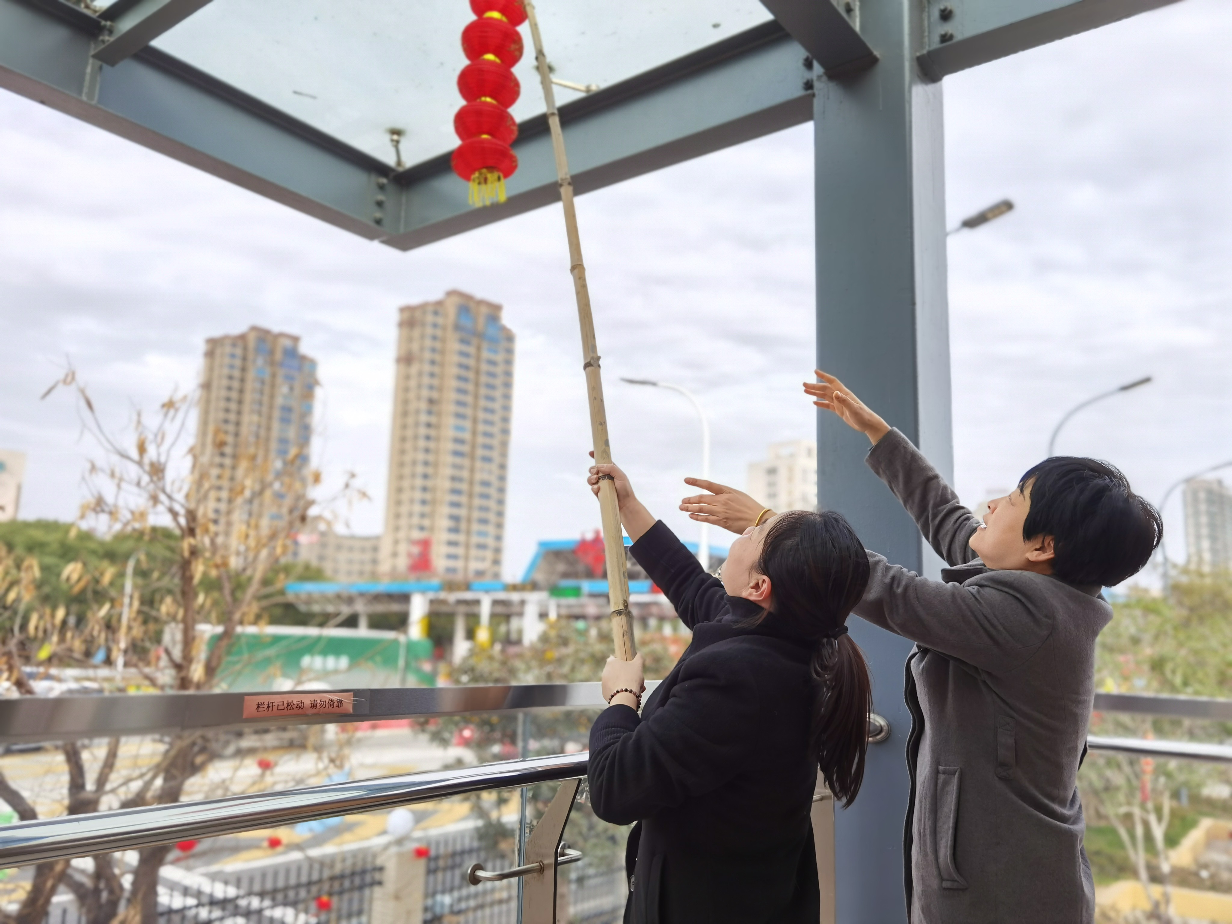 大家分工合作,搬梯子、遞春聯、貼膠帶、校正高低。在站所內每個角落都掛上了紅彤彤的燈籠;收費區域內廣場兩邊的欄桿上扎著一面面彩旗。一幅幅精致喜慶的對聯、“福”字,一串串三角彩旗,一個個大紅燈籠把整個收費站所點綴得處處洋溢著濃厚的節日氛圍,“年味”十足,讓在站員工和過往司乘朋友感受到新年的喜慶氛圍和“家”的溫暖。