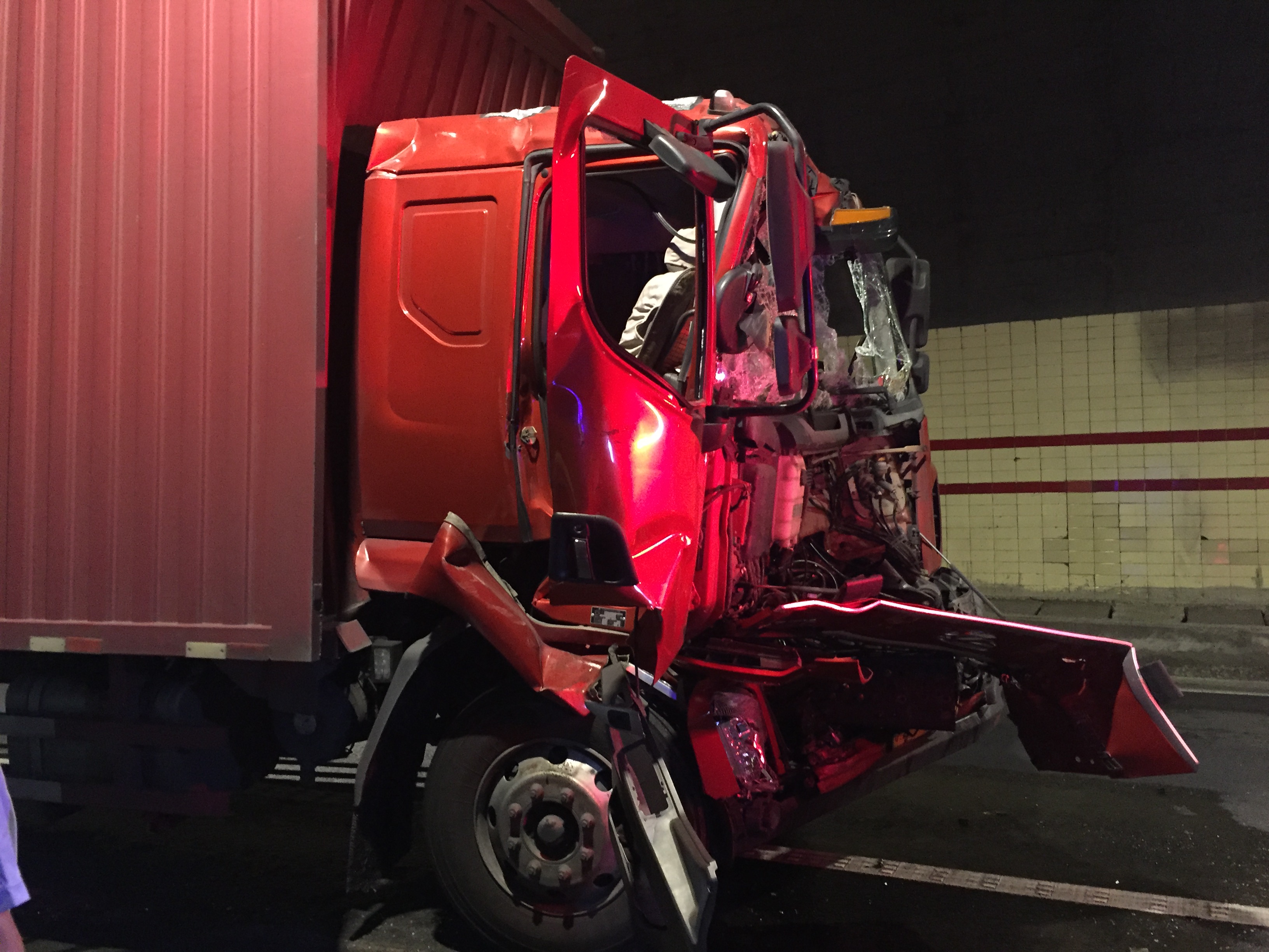 圖為事故車輛 接警后,執勤隊員立即奔赴現場,做好車輛預警工作。現場兩輛廂式貨車停在慢車道上,后貨車的副駕駛室被擠壓得嚴重變形,幸好副駕駛位置無人,否則后果不堪設想。受傷的司機坐在電纜溝上,右手臂一直流血,意識清醒。見司機受傷,隊長通知中控員撥打救護車。前車已經停在電纜溝上,但是車輛不能移動,隊員們向司機詢問之后才了解,前車漏機油,兩車都需要拖車。隊員們一邊在隧道內疏通交通一邊在等候救護車和拖車,16:26分,救護車到達現場將受傷司機帶走,17:50分,拖車將兩輛事故貨車拖離,現場恢復通車。該起事故造成隧道內車輛緩行兩個小時,期間封道十多分鐘,事故原因是前車有故障緩慢行駛,因無任何警示標志,后車沒有注意而造成追尾。 在此提醒各位司機朋友,由于隧道內外亮度不同,進入隧道請提前開燈減速慢行,在行車過程中要注意前面路況,發現有問題及時減速慢行,并保持安全車距。如遇突發狀況,車子無法正常行駛時,為了自已和他人的安全,請及時報警并做好相應警示標志,防止二次事故的發生。 陳旦平