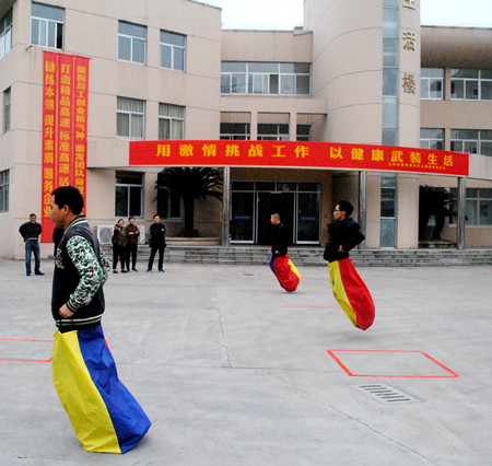 圖為“跳袋鼠”比賽 上午9點(diǎn)整,隨著臺州收費(fèi)所所長、分工會會長王小勇的一聲令下,趣味競技活動正式拉開帷幕。此是自分工會成立以來第一次組織的妙趣橫生的集體活動,參加人員個個摩拳擦掌、躍躍欲試,有的迫不及待地在一旁先練開了。 此次趣味活動本著“重在參與、愉悅身心、全民健身”的原則,以豐富員工健康向上的業(yè)余文化生活為目的,分集體和個人兩種比賽方式。集體項目有“二龍戲珠”、“齊心協(xié)力”、“我是喬丹”、“集體跳繩”共4項;個人項目有“絕對公平”、“夾豆比賽”、“單人跳繩”、“跳袋鼠”、“車輪滾動”共5項。在集體項目中,各隊配合默契,勇往直前;單人賽中,各位員工積極參與,有幾個為爭第一不小心摔倒,手掌擦破了皮,褲子摔破了也絕不放棄,爬起來繼續(xù)參加比賽,堅持到最后。