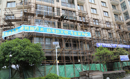 圖為溫嶺水韻新邨外墻維修工程現場 在結束文鼎苑工地的檢查后,羅小將來到溫嶺水韻新邨小區外墻修復工程的現場進行安全檢查。在現場,他仔細查看了外墻腳手架搭建情況,詳細了解相關安全措施的落實情況,他囑咐施工方一定要把安全各項措施做細做實,保質保量地完成外墻修復工程。 包啟曉